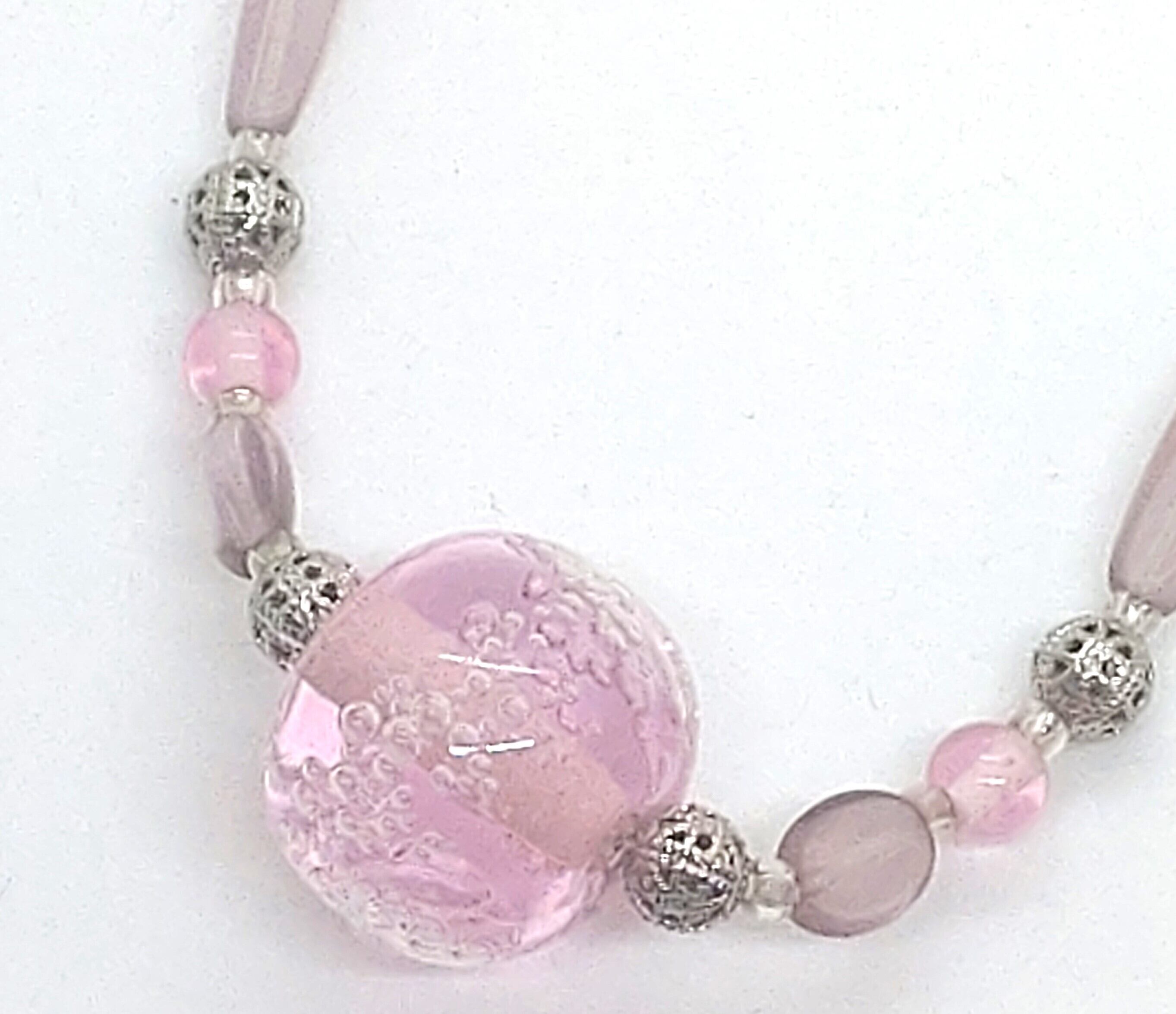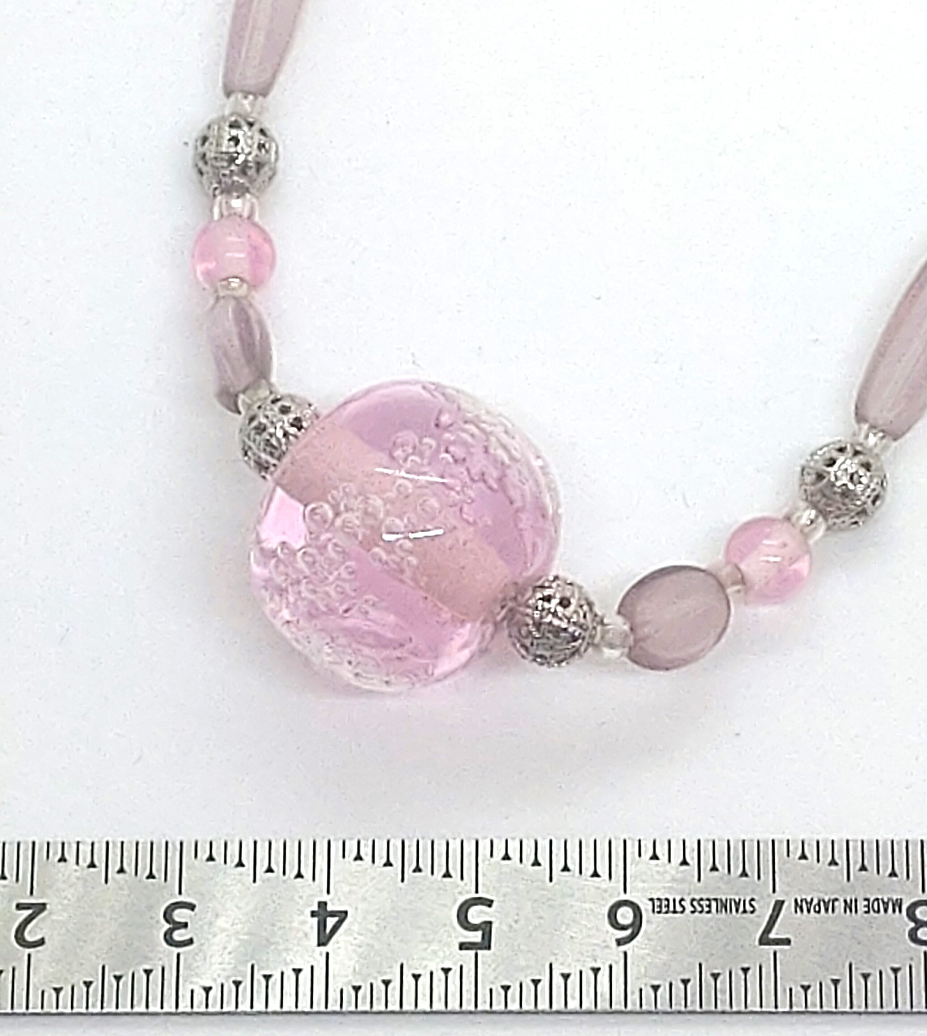 桜もちのような色合いに泡をとじこめたとんぼ玉を使ったペンダントです。